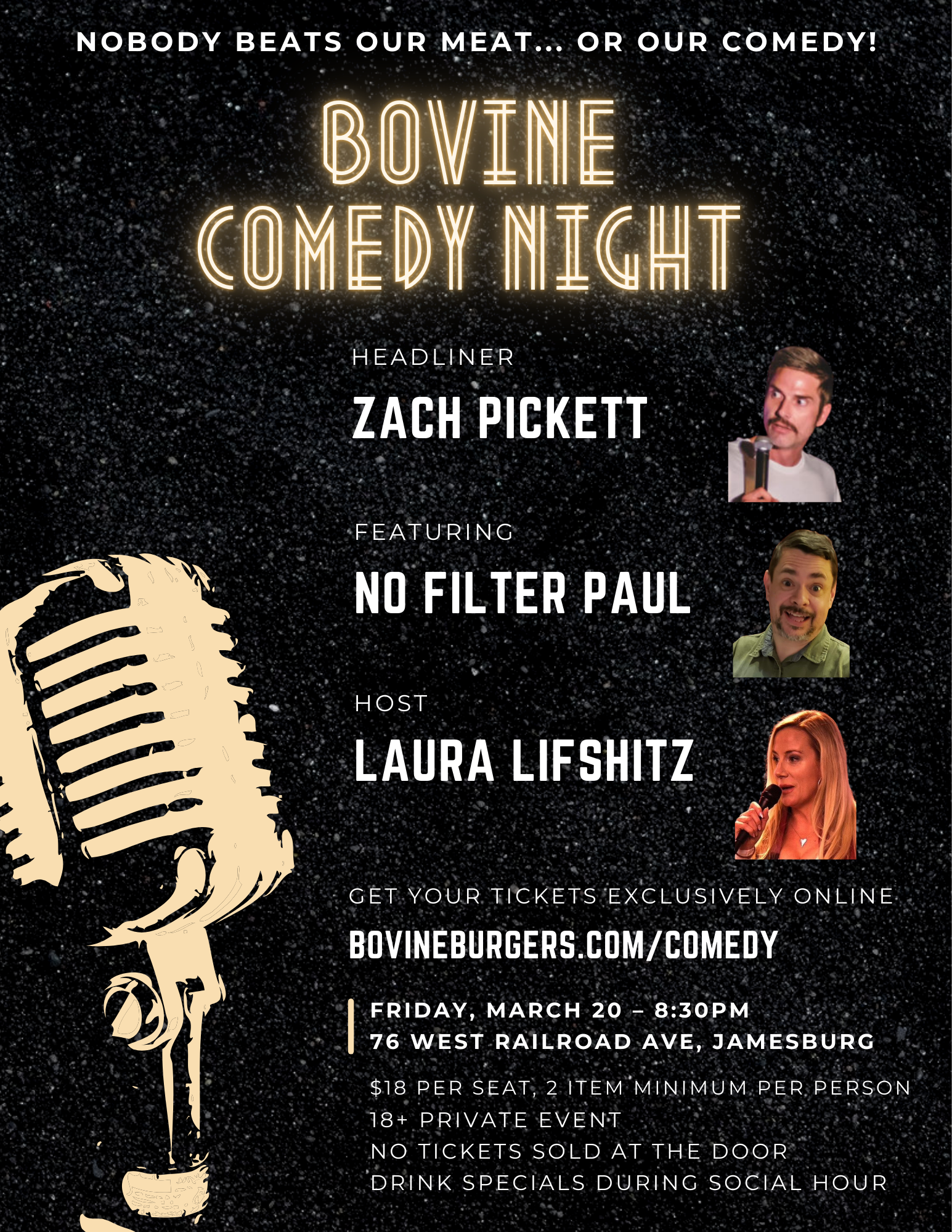 Get your tickets now for our next private comedy night event at Bovine on Friday, March 20th!