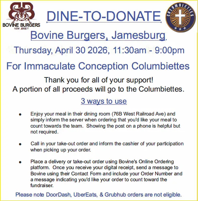 Please join us for our Dine to Donate event supporting the Immaculate Conception Columbiettes! A portion of all qualifying purchases made on Wednesday, April 30th will be donated directly back to the group.